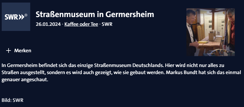 Im Rahmen des LEADER-Programms der EU wird das Projekt „Die Straße. Verbindet“ mit einer Fördersumme von 200.000 Euro unterstützt. Dieses Projekt, das von der LAG „Vom Rhein zum Wein“ gefördert wird, zielt darauf ab, das Deutsche Straßenmuseum in Germersheim neu zu gestalten. Auf einer Ausstellungsfläche von rund 5000 m² wird die Geschichte des Straßen- und Verkehrswesens von den frühen Anfängen des Straßenbaus bis hin zu modernen Themen wie E-Mobilität und nachhaltiger Mobilität interaktiv und verständlich präsentiert.